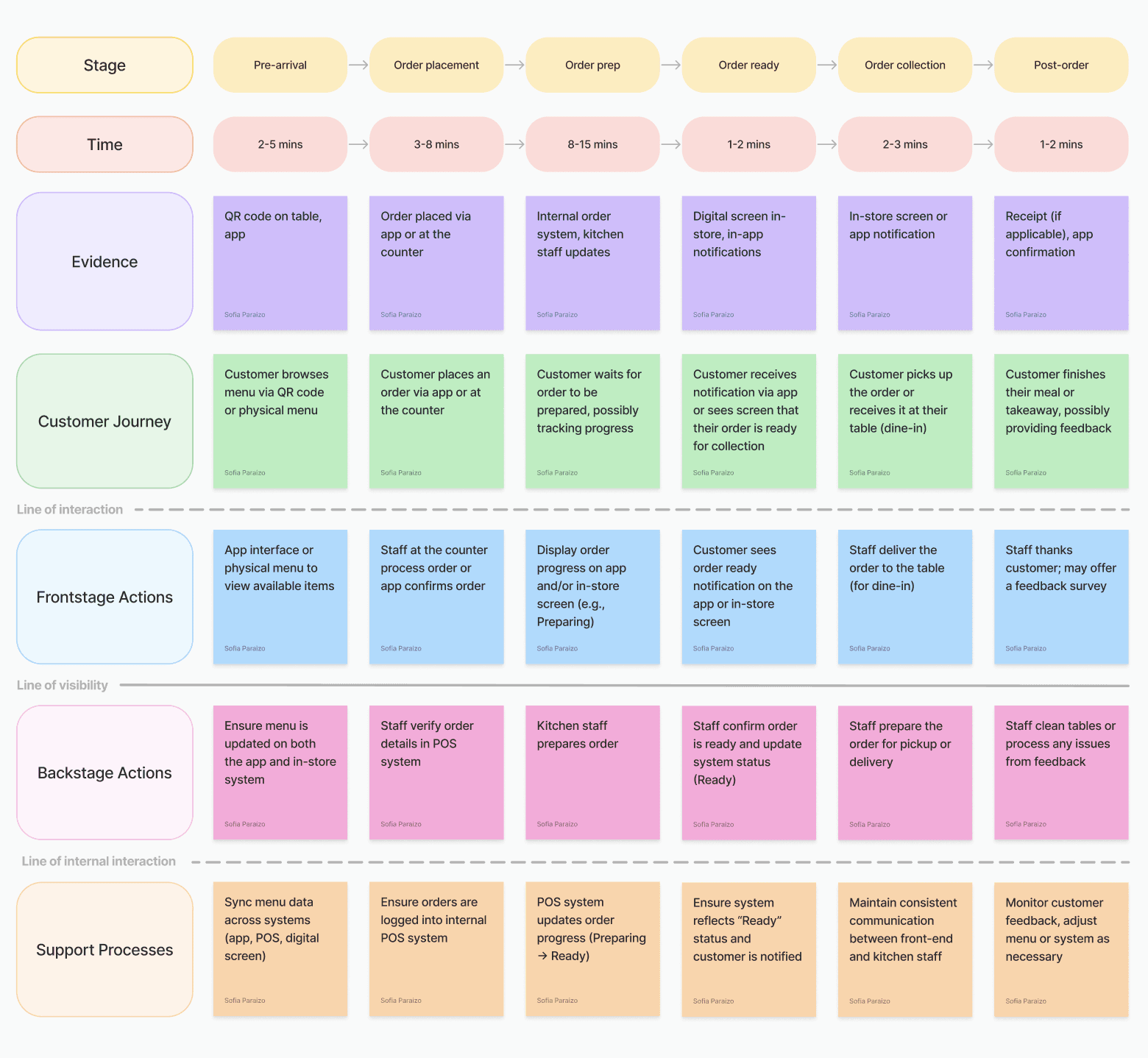 This service blueprint illustrates how the redesigned café experience should function, mapping both customer and staff interactions. It highlights the smoother ordering flow, real-time updates, and clear responsibilities for staff, ensuring that the café operates efficiently while customers stay informed and engaged.